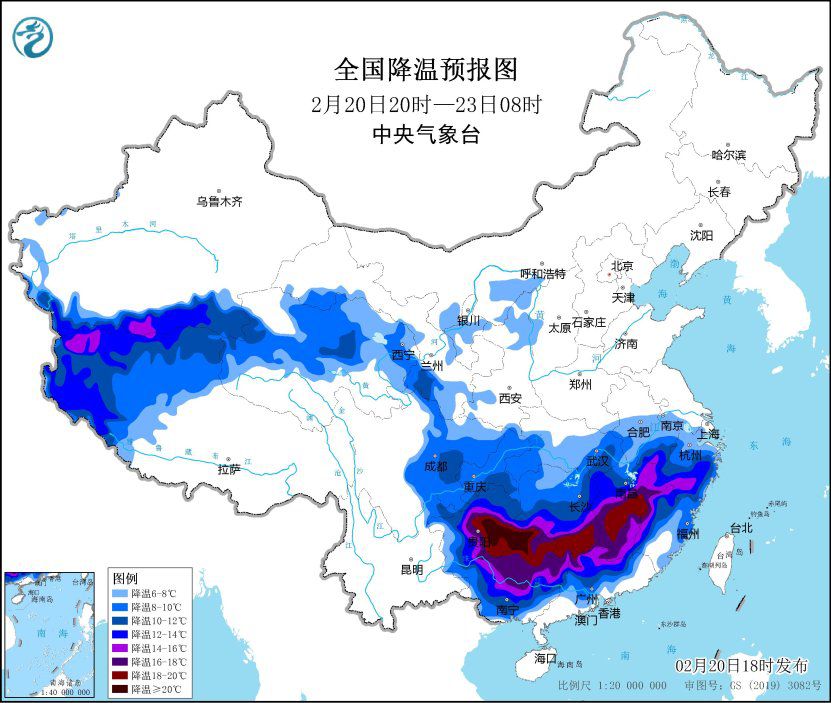 中新網(wǎng)2月20日電 據(jù)中央氣象臺網(wǎng)站消息,中央氣象臺2月20日18時繼續(xù)發(fā)布寒潮橙色預(yù)警:受寒潮影響,預(yù)計,2月20日20時至2月23日,我國南方大部地區(qū)將出現(xiàn)降溫,日平均或最低氣溫普遍下降8~12℃,西南地區(qū)東南部、江南大部、華南中北部等地氣溫下降12~18℃,其中,貴州東南部、湖南西南部、廣西北部等地的部分地區(qū)累計降溫幅度可達20℃以上。2月23日前后,最低溫度0℃線將南壓到蘇皖南部至湖南南部、貴州南部一帶。