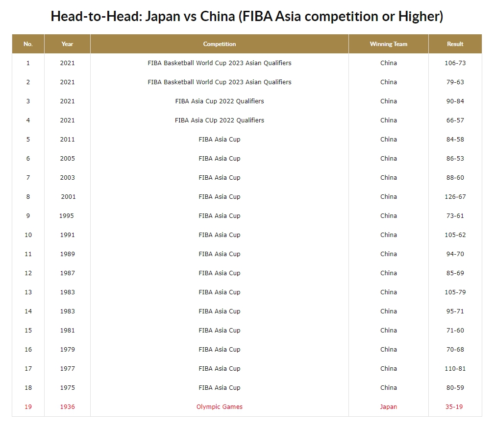 據(jù)國際籃聯(lián)統(tǒng)計,自1936年奧運會以來,中國男籃從未在FIBA國際籃聯(lián)舉辦的亞洲杯及更高級別比賽中負于日本男籃。