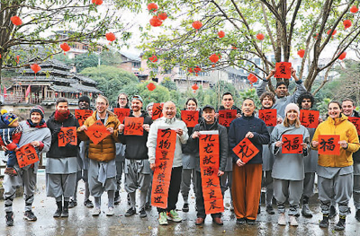 春節(jié)期間,廣西壯族自治區(qū)桂林市靈川縣九屋鎮(zhèn)西嶺山莊迎來一批外國客人,他們一起寫福字、磨豆腐、舂糍粑、釀圓子……沉浸式體驗中國傳統(tǒng)民俗,現場歡聲笑語不斷。