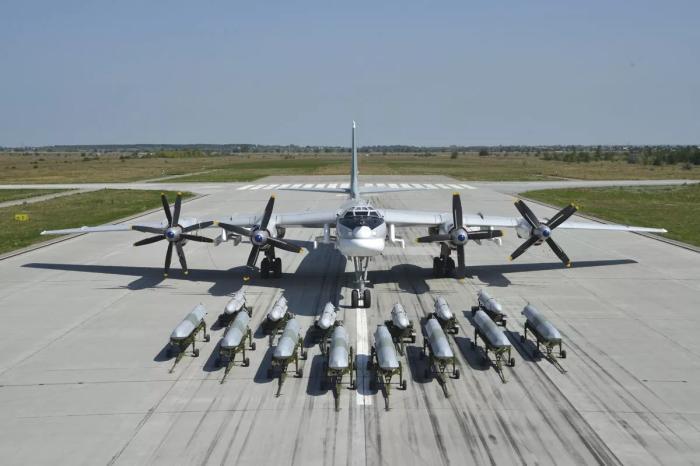 俄一架圖-95MS轟炸機前擺放著14枚導(dǎo)彈。圖片來源:俄羅斯國防部