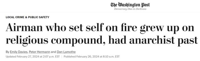 標題為《自焚的空軍在宗教場所長大,有無政府主義的過往》。顯然,這樣的標題在強烈暗示布什內(nèi)爾的行為可能受到極端宗教和極左思想的影響。