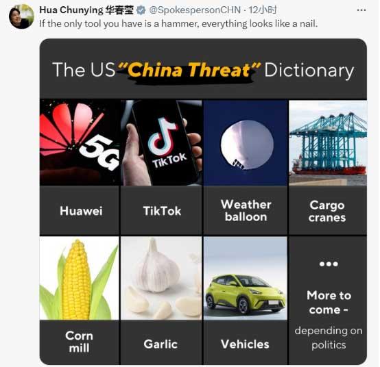 華春瑩最后回擊,“如果你唯一的工具是錘子,那么所有東西看起來都像釘子。”這條帖文隨附圖片上,列出美國以往炒作“中國威脅”的詞典:包括華為,TikTok,氣象無人飛艇,起重機,玉米加工廠,大蒜,汽車……還有更多,取決于政治因素?!?/p>