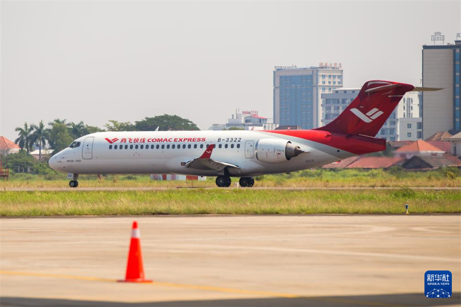 這是3月4日在老撾萬象瓦岱國際機場拍攝的ARJ21飛機。新華社發(fā)(凱喬攝)