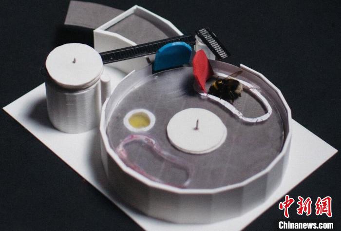 這個(gè)兩步謎題盒中黃色圓圈位置有一滴糖水,透過(guò)透明塑料蓋可以看到。要獲得獎(jiǎng)勵(lì)蜜蜂必須推動(dòng)紅色標(biāo)簽旋轉(zhuǎn)透明蓋子,直到標(biāo)簽后的月牙形開(kāi)口位于黃色液滴上方。不過(guò)只有先推開(kāi)藍(lán)色標(biāo)簽,才能移動(dòng)紅色標(biāo)簽。(圖片來(lái)自倫敦瑪麗女王大學(xué))。施普林格·自然/供圖