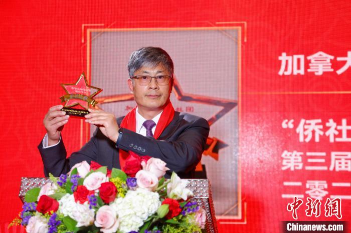當(dāng)?shù)貢r間3月8日晚,加拿大福建社團(tuán)聯(lián)合總會在多倫多舉辦2024甲辰龍年迎春團(tuán)拜會。圖為該會主席林慶清在致辭時展示2023年11月第三屆世界閩籍華僑華人社團(tuán)聯(lián)誼大會向加拿大福建社團(tuán)聯(lián)合總會頒授的“僑社之星”獎杯?!≈行戮W(wǎng)記者 余瑞冬 攝