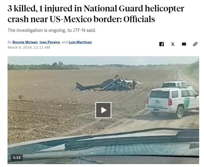 中新網(wǎng)3月9日電 據(jù)美媒報道,當(dāng)?shù)貢r間3月8日,一架美國國民警衛(wèi)隊直升機(jī)在美墨邊境附近墜毀,造成3人死亡、1人受傷。