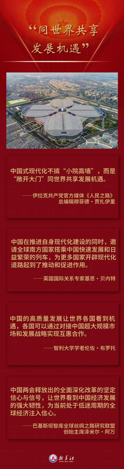 如何推動中國式現(xiàn)代化建設,是國際社會長期關注中國的一大焦點。透過中國全國兩會窗口,國際輿論和海外人士看到,在中國式現(xiàn)代化的道路指引下,中國經(jīng)濟社會發(fā)展取得令人矚目的成績,給世界各國帶來合作共贏的新機遇,中國式現(xiàn)代化為人類實現(xiàn)現(xiàn)代化提供了新選擇,為發(fā)展中國家拓展現(xiàn)代化路徑提供了有益啟示。