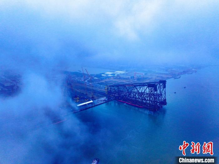 3月12日,亞洲第一深水導管架“?;枴痹趶V東珠海建造完工。這是“海基二號”導管架裝船后全景。(中國海油供圖)