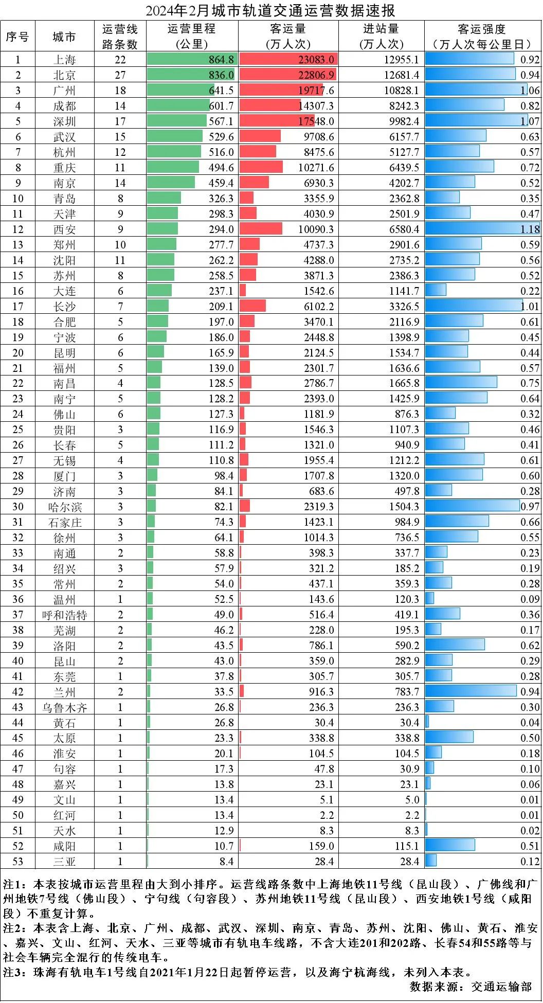 其中,地鐵、輕軌、市域快速軌道等大運(yùn)量線路共267條,運(yùn)營里程9499.8公里,完成客運(yùn)量20.1億人次,進(jìn)站量12.1億人次;單軌、磁浮等中運(yùn)量線路共7條,運(yùn)營里程202.5公里,完成客運(yùn)量3175萬人次,進(jìn)站量2304萬人次;有軌電車、自動導(dǎo)向軌道等低運(yùn)量線路共34條,運(yùn)營里程503.3公里,完成客運(yùn)量888萬人次,進(jìn)站量851萬人次。(中新財經(jīng))
