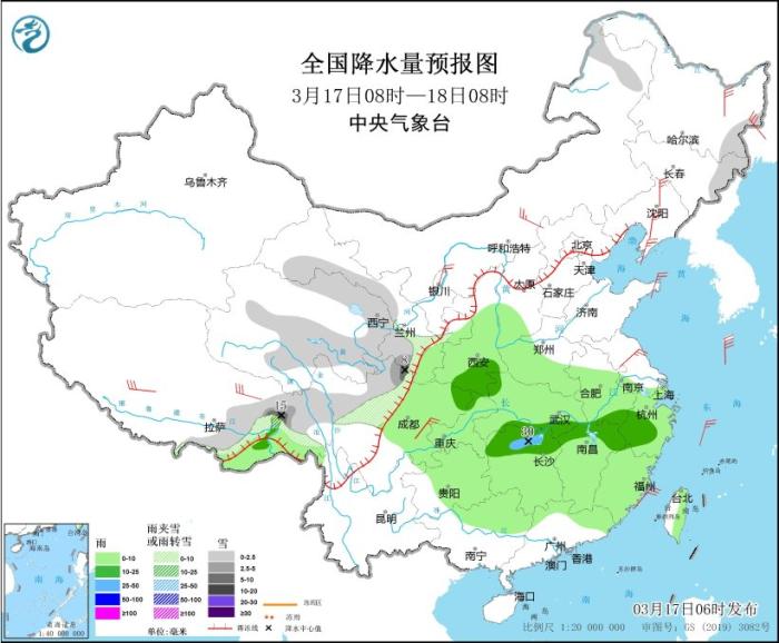 3月17日08時至18日08時,西藏東部、青海東北部和南部、甘肅南部、川西高原北部、內蒙古東北部、黑龍江東部、吉林東部等地部分地區(qū)有小到中雪或雨夾雪,其中,西藏東部、川西高原北部等地局部地區(qū)有大到暴雪(10~15毫米)。西藏東南部、西北地區(qū)東部、西南地區(qū)東部、黃淮西部、江淮中西部、江漢、江南、華南北部等地部分地區(qū)有小到中雨,其中,湖南北部等地部分地區(qū)有大雨(25~30毫米)。內蒙古中西部、黑龍江東部、遼寧中北部、遼東半島、山東半島、江蘇中部、四川盆地中部等地部分地區(qū)有4~6級風。