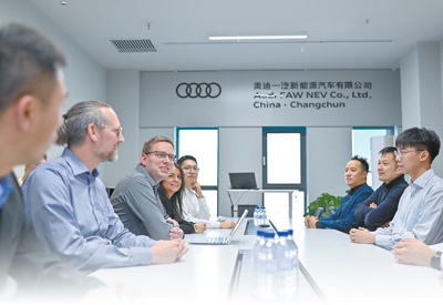 近年來,許多外國專家感受到發(fā)展機遇,來到中國安居樂業(yè)。圖為德國工程師薩沙(左三)與妻子約翰娜(左四)在位于吉林長春的奧迪一汽新能源汽車有限公司會議室開會。
