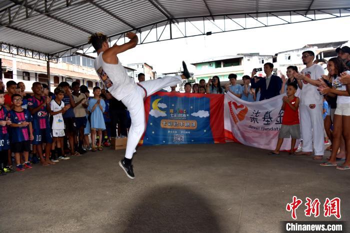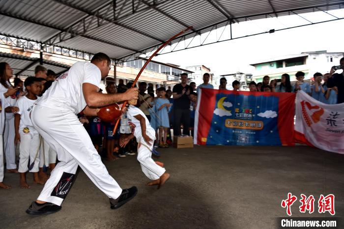 當(dāng)?shù)貢r間3月23日,巴西里約熱內(nèi)盧石頭河社區(qū),巴西“戰(zhàn)舞”舞者為來自加拿大的華僑華人小朋友表演?!≈行律缬浾?林春茵 攝