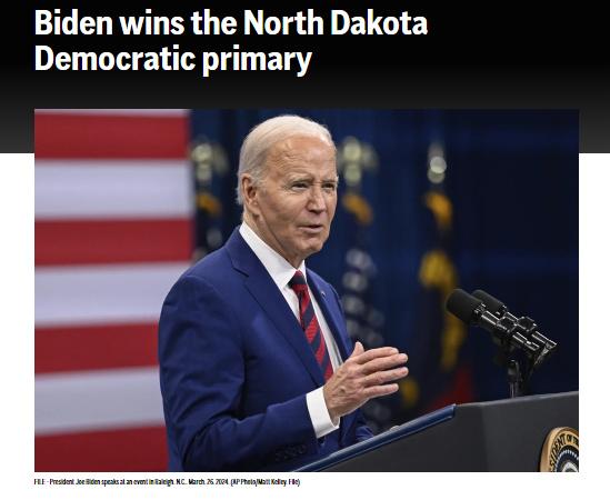 中新網(wǎng)3月31日電 據(jù)美聯(lián)社報(bào)道,當(dāng)?shù)貢r間30日,根據(jù)計(jì)票結(jié)果顯示,美國現(xiàn)總統(tǒng)拜登贏得2024年美國總統(tǒng)選舉北達(dá)科他州民主黨初選。