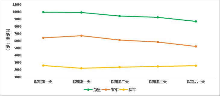 預(yù)計清明假期,普通公路日均斷面交通量約9550輛,假期前一天與第一天交通量相對較高,隨后有所下降。