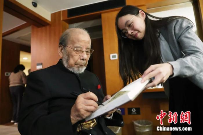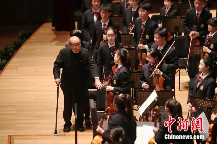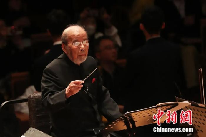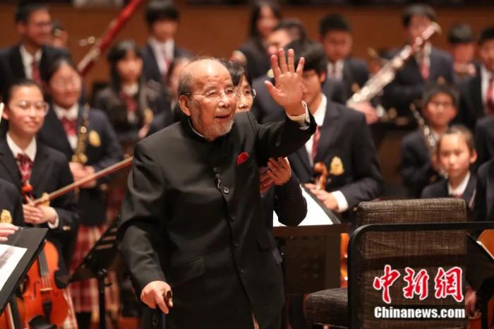 音樂會的尾聲,99歲高齡的中國著名指揮家曹鵬在長達(dá)一分半的掌聲中登上指揮臺。
