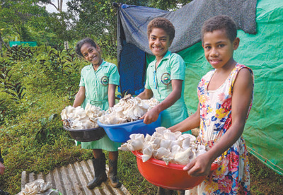 中國(guó)政府面向斐濟(jì)等太平洋島國(guó)推廣菌草技術(shù),推動(dòng)當(dāng)?shù)亟?jīng)濟(jì)發(fā)展,助力當(dāng)?shù)孛裆纳?。圖為在斐濟(jì)奈塔希里乳業(yè)婦女組織菌草技術(shù)示范點(diǎn),孩子們正在幫忙采菇。