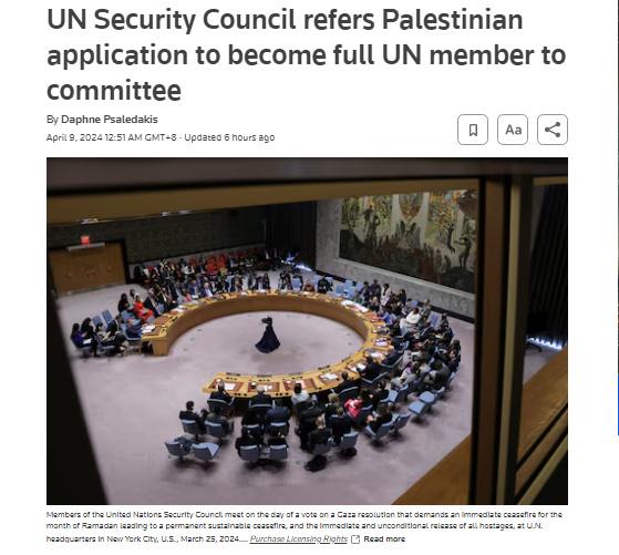 中新網(wǎng)4月9日電 據(jù)路透社報(bào)道,當(dāng)?shù)貢r(shí)間4月8日,聯(lián)合國安理會將巴勒斯坦成為聯(lián)合國正式會員國的申請?zhí)峤话怖頃鲁蓡T接納委員會。