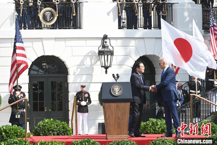當(dāng)?shù)貢r(shí)間4月10日,美國總統(tǒng)拜登與來美國事訪問的日本首相岸田文雄在白宮舉行會(huì)晤。圖為雙方出席白宮歡迎儀式。中新社記者 陳孟統(tǒng) 攝