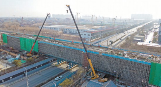 京唐城際鐵路燕郊段跨思菩蘭路連續(xù)梁建設(shè)現(xiàn)場。 河北日報記者 趙永輝攝