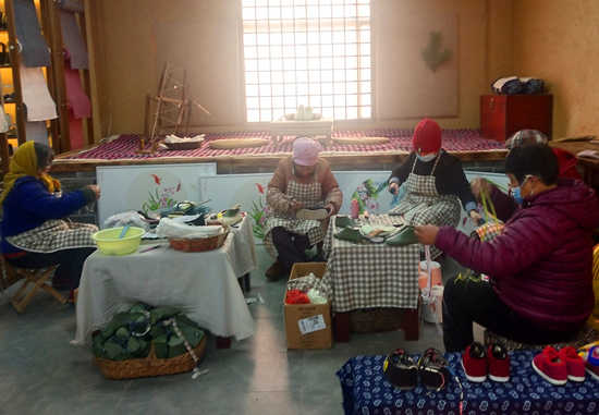 北莊團(tuán)結(jié)手工坊工人在納鞋底。 實(shí)習(xí)生 駱金瑾攝