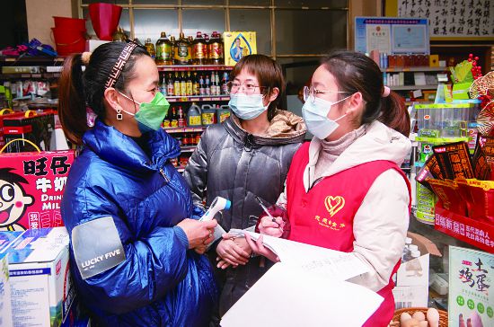 1月11日,在金華婺城區(qū)城北街道站前社區(qū),放寒假回金的大學生傅雨曦,穿上紅馬甲協(xié)助社區(qū)工作人員到沿街店鋪核查防疫措施落實情況,打電話了解外地返金人員行程及疫苗接種情況。傅雨曦說,她是共青團員,和同學報名參加婺城大學生寒假疫情防控志愿服務,在社區(qū)、疫苗接種點等地做公益服務。(時寬兵)