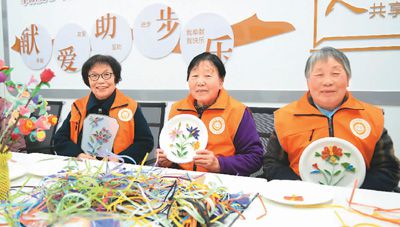 馬玉梅(左)等老年志愿者展示準備捐獻的手工藝品。 李 樂攝