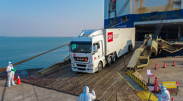 1月15日上午,載運(yùn)著6輛北京冬奧會(huì)轉(zhuǎn)播車的韓國籍“現(xiàn)代英勇”輪靠泊天津港。本批冬奧物資由天津出入境邊防檢查總站東港邊檢站完成快速入境查驗(yàn)后,將直接運(yùn)送至北京冬奧場館。