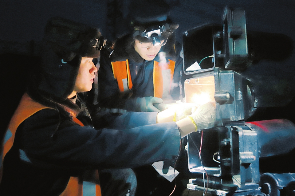 中國鐵路太原局集團有限公司侯馬電務段加大精檢細修力度,全力消除各種安全隱患,力保春運安全暢通。圖為1月17日春運首日,該段侯馬車間禮元信號工區(qū)職工,利用凌晨5時26分至7時26分的“天窗時間”認真檢修作業(yè)。(白鵬攝)