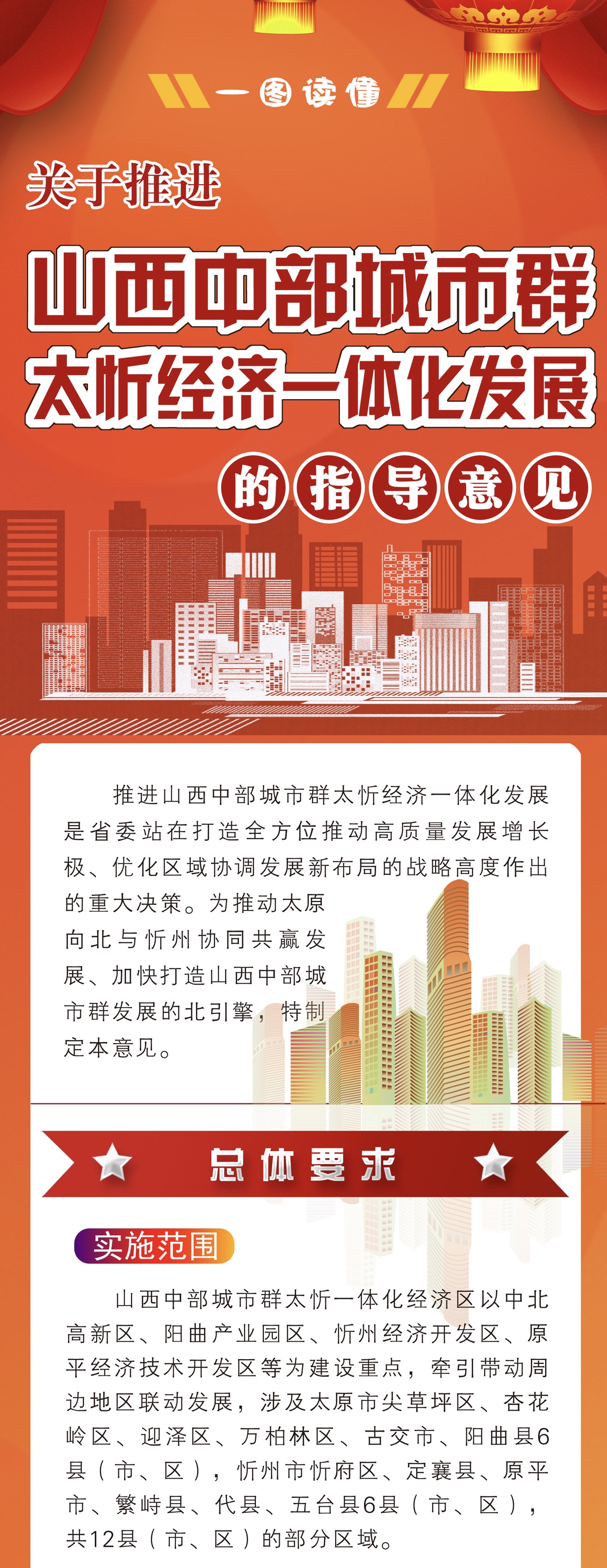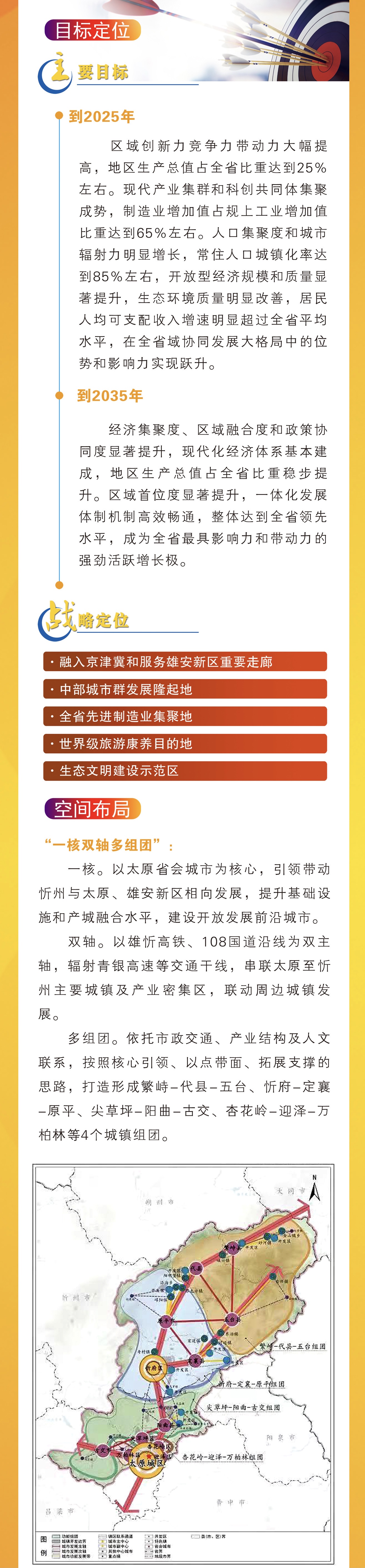 《指導(dǎo)意見》謀劃確定了太忻一體化經(jīng)濟區(qū)的實施范圍,提出了融入京津冀和服務(wù)雄安新區(qū)重要走廊、中部城市群發(fā)展隆起地、全省先進制造業(yè)集聚地、世界級旅游康養(yǎng)目的地、生態(tài)文明建設(shè)示范區(qū)等五大戰(zhàn)略定位和“一軸雙核多組團”的空間布局,分2025年、2035年兩個時間節(jié)點明確了發(fā)展目標(biāo),部署了六個方面的重點任務(wù)。