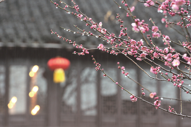 雨中紅梅迎春開