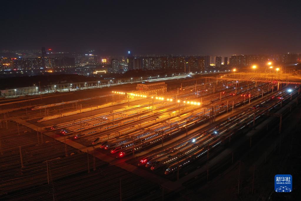 1月16日晚,動車組列車??吭谥袊F路蘭州局集團(tuán)有限公司蘭州車輛段蘭州西動車運用所整備場上,為1月17日開始的2022年春運做好準(zhǔn)備(無人機(jī)照片)。新華社記者 杜哲宇 攝