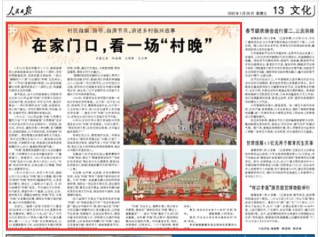 1月25日至26日,農(nóng)歷小年之際,國(guó)家公共文化云推出“村晚”接力云展播,集中展示《我的“村晚”我的年》融媒體節(jié)目,以及來(lái)自內(nèi)蒙古、黑龍江、上海等20個(gè)?。▍^(qū)、市)的30場(chǎng)精彩“村晚”活動(dòng)。節(jié)目通過(guò)文化傳承、時(shí)代新風(fēng)、展望未來(lái)3個(gè)篇章,以訪談、互動(dòng)、游戲等方式,展播各地特色“村晚”節(jié)目、分享“村晚”臺(tái)前幕后故事、展現(xiàn)鄉(xiāng)村振興美好畫(huà)卷、推介鄉(xiāng)村美景好物。