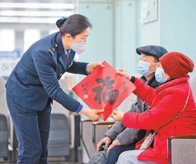 春運(yùn)期間,南京火車站從細(xì)節(jié)著手、小事出發(fā),推出了一系列溫馨服務(wù)?!?58”雷鋒服務(wù)站購(gòu)置一批適合兒童使用的口罩,教孩子們?nèi)绾握_佩戴,同時(shí)為乘車旅客送上春聯(lián)、窗花或“福”字。圖為“158”雷鋒服務(wù)站客運(yùn)值班員為旅客送上新春祝福。