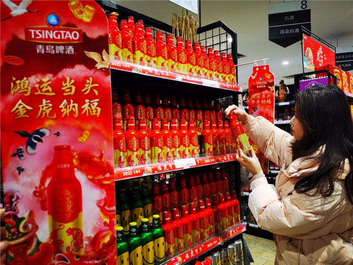 年味不僅是物質(zhì)上的豐富,也有文化上的追求。“過(guò)年就買(mǎi)‘鴻運(yùn)當(dāng)頭’,圖個(gè)好彩頭?!毕M(fèi)者王先生每年過(guò)年都會(huì)“鴻運(yùn)當(dāng)頭,先囤一波”,作為年夜飯的“必選項(xiàng)”。“年夜飯必須紅紅火火,不管是名字還是包裝,鴻運(yùn)當(dāng)頭就是喜慶,而且酒也好喝,每年還出不同的生肖版,我都收藏著著呢。”許多消費(fèi)者表示,這款青島啤酒成為春節(jié)當(dāng)之無(wú)愧的“鴻運(yùn)”年貨,走親訪友拎上一提,年味就出來(lái)了。