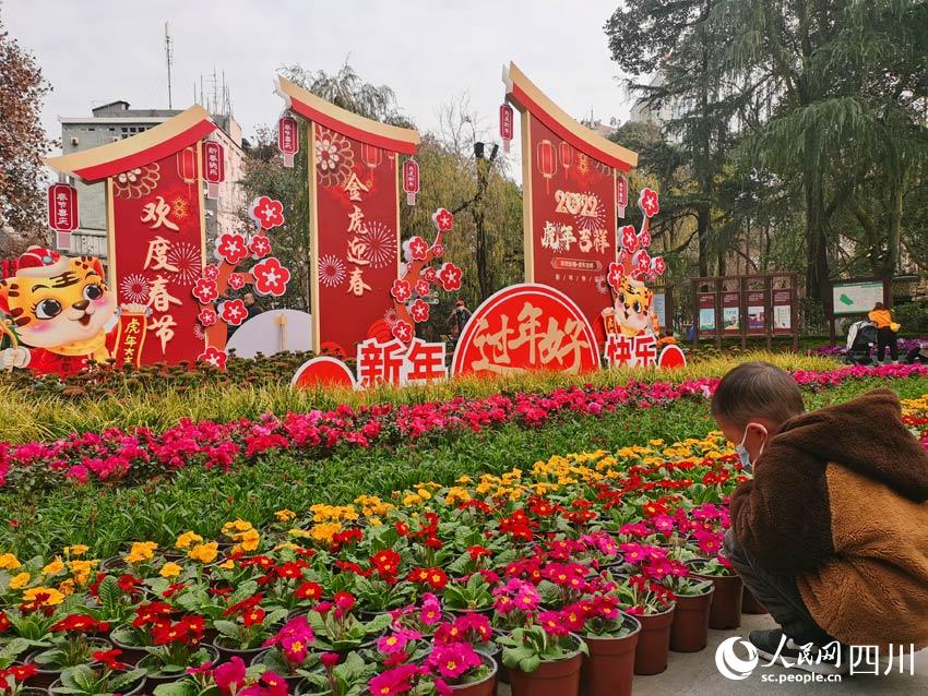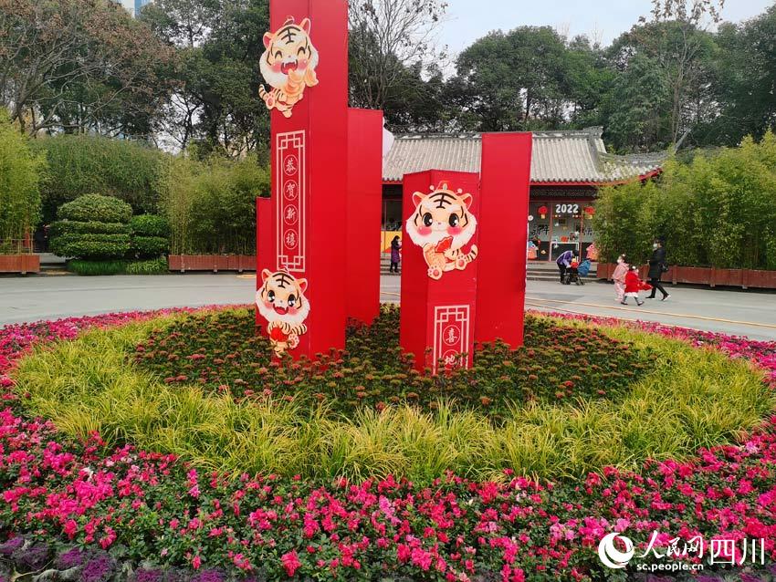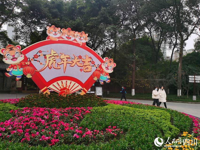 園內(nèi)的幾處空地上,布置了幾個花壇。上邊除了吉祥的紅黃色彩,還有可愛的動漫形象老虎圖案?!盎⒛昙椤薄敖鸹⒂骸薄靶履昕鞓愤^年好”……各種好彩頭的詞語,標(biāo)示出歡度春節(jié)的主題,看了讓人精神為之一振。