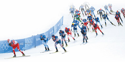 圖為2月19日,參賽選手在越野滑雪男子50公里集體出發(fā)(自由技術(shù))比賽中。受天氣影響,賽程縮短為30公里。