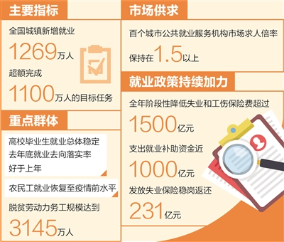 看主要指標,全國城鎮(zhèn)新增就業(yè)1269萬人,超額完成1100萬人的目標任務;全年全國城鎮(zhèn)調查失業(yè)率平均值為5.1%,比上年平均值下降0.5個百分點,就業(yè)目標任務圓滿完成。