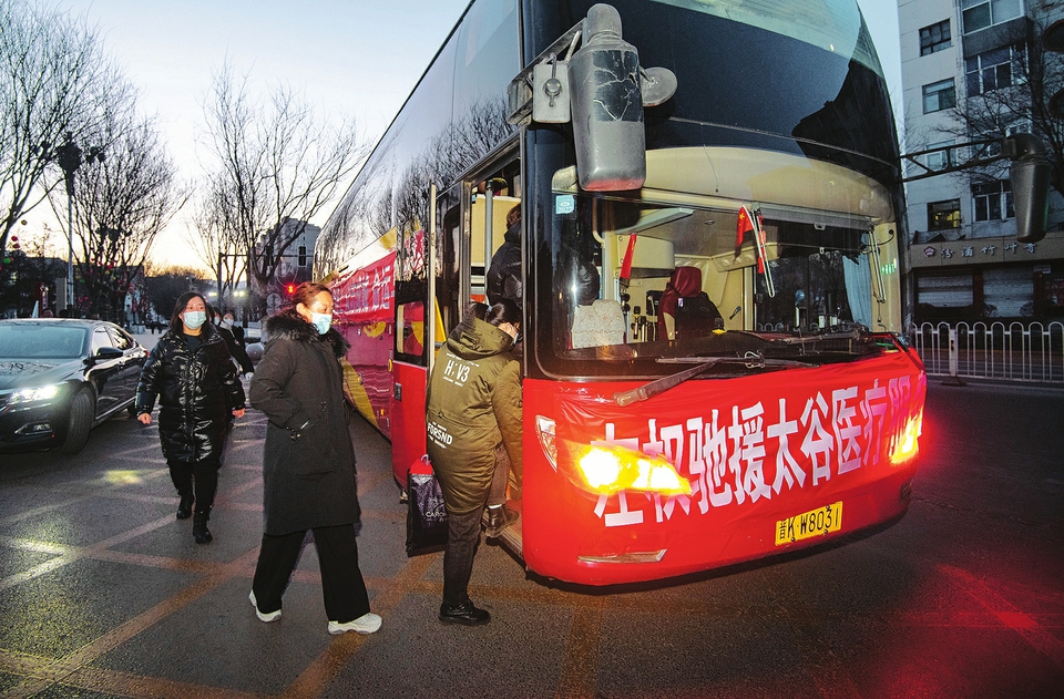 2月22日,左權(quán)縣馳援太谷區(qū)核酸采樣服務(wù)隊(duì)醫(yī)護(hù)人員乘專車赴太谷開展核酸檢測(cè)采樣工作。這是繼2月20日,該縣派出的第三批援谷醫(yī)護(hù)人員。(張文軍攝)