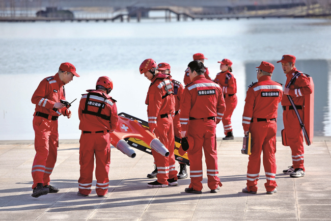 2月24日下午,在嘉興秀湖畔,怡恩公益救援隊(duì)組織隊(duì)員開展應(yīng)急救援訓(xùn)練,以此提高隊(duì)員們的應(yīng)急救援能力。(馮玉坤)