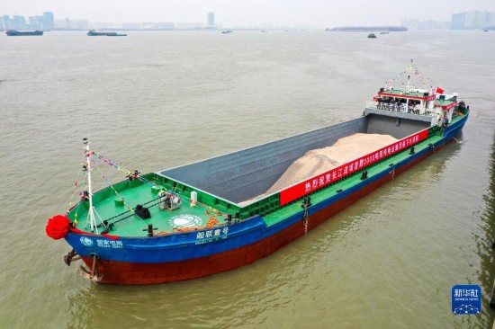2月22日,“船聯(lián)1號”電動貨船在長江南京段航行(無人機照片)。