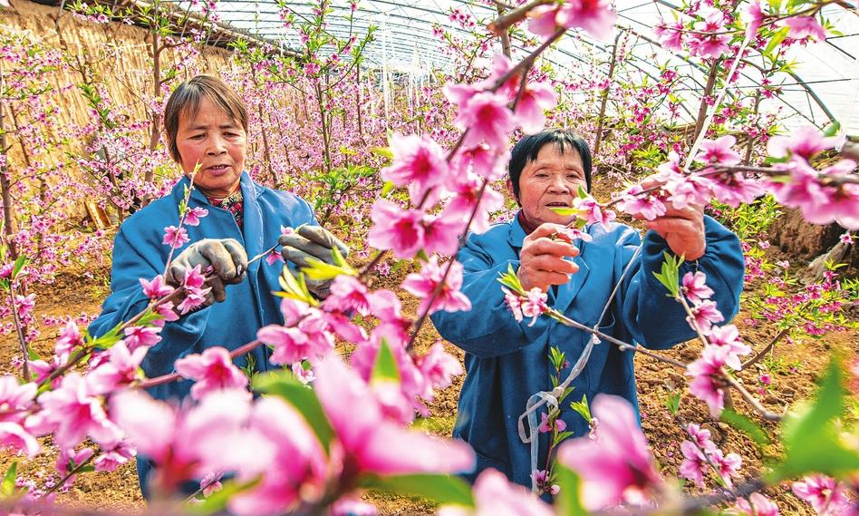 2月24日,夏縣南大里鄉(xiāng)南北晉村郭老蔬菜種植專業(yè)合作社社員在大棚內(nèi)給油桃疏花。該社根據(jù)本村地理氣候特點,從山東引進(jìn)新品種,搭建11個大棚發(fā)展新品種油桃。該油桃成熟早、酸甜可口,遠(yuǎn)銷四川、河北等地,畝收入達(dá)2萬多元。(薛俊攝)