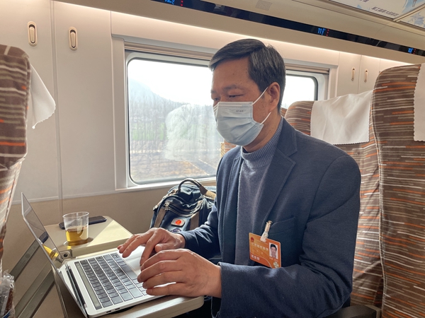 赴京參會(huì)途中,全國人大代表、南京市第一醫(yī)院副院長陳鑫抓緊時(shí)間修改建議。鹿偉攝