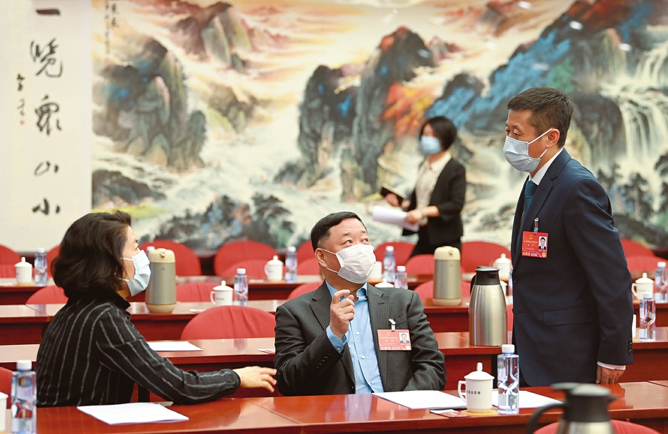 圖為閻美蓉、郝旭、劉正代表(左起)在一起交流。(記者李聯(lián)軍攝)