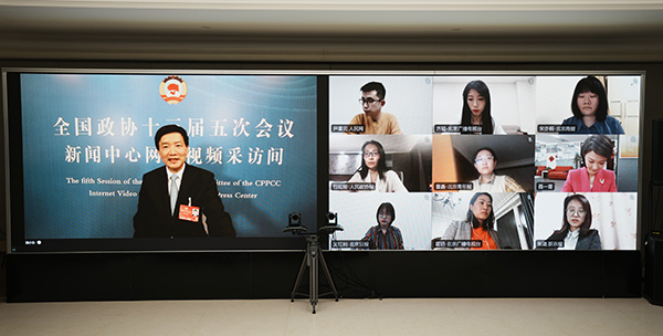北京市政協(xié)主席魏小東通過云平臺接受集體采訪。(北京市政協(xié)供圖)