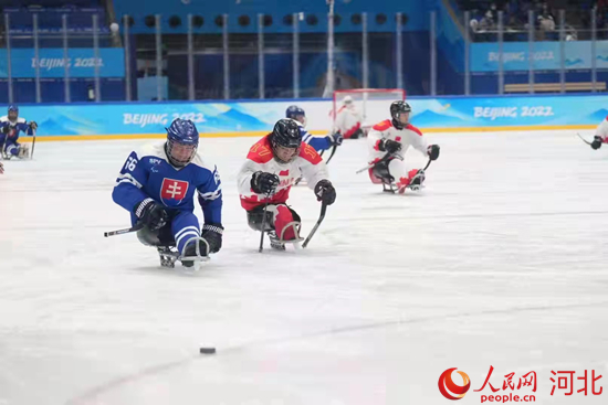申翼風(fēng)(中)在北京2022年冬殘奧會(huì)冰球項(xiàng)目比賽中拼盡全力。 申翼風(fēng)本人供圖