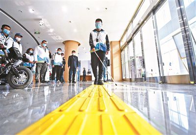 北京2022年冬殘奧會正在舉行,殘奧運動員在賽場上的奮勇拼搏贏得了世界的掌聲。作為冬殘奧會的舉辦地之一,近年來,北京市的無障礙環(huán)境服務保障水平顯著提升且更有溫度。昨天,剛啟用不久的北京市殘疾人服務示范中心(以下簡稱“示范中心”)迎來了16位城市志愿者。他們在冬奧組委無障礙體驗員的帶領(lǐng)下,戴上眼罩體驗盲道、坐在匯愛影廳里“聽”電影、體驗科技助殘的力量。