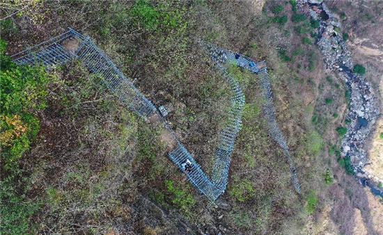 在四川省涼山彝族自治州昭覺縣阿土列爾村的懸崖鋼梯上,村民沿著鋼梯下山(2020年5月13日攝)。新華社記者 王曦 攝