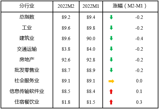 2022年2月中國(guó)中小企業(yè)發(fā)展指數(shù)分行業(yè)情況。來(lái)源:中國(guó)中小企業(yè)協(xié)會(huì)
