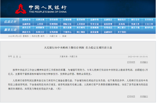 此舉引發(fā)社會各界廣泛關注,多位業(yè)界人士表示,中央銀行結存利潤上繳財政,是世界主要經濟體的通行做法。就我國而言,2022年政府工作報告明確,要保證赤字率下調、財政支出增長,人民銀行此舉是在積極落實該項舉措。此舉屬于財政政策范疇,對資金的流動性影響有限,但可經直達機制精準到達縣區(qū)基層,對支持助企紓困、穩(wěn)就業(yè)保民生、穩(wěn)定宏觀經濟大盤有著積極作用。