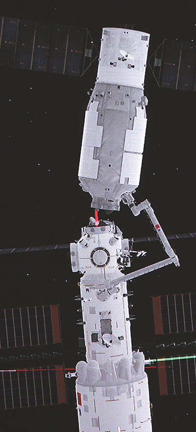 在北京航天飛行控制中心拍攝的空間站機(jī)械臂轉(zhuǎn)位貨運(yùn)飛船試驗(yàn)畫面,天舟二號貨運(yùn)飛船在機(jī)械臂拖動下,以核心艙節(jié)點(diǎn)艙球心為圓心進(jìn)行平面轉(zhuǎn)位。